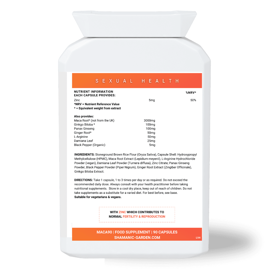 A specialist combination maca root, herb and mineral formula, designed to support sexual health, fertility and reproduction. This food supplement combines 3000mg of maca root with ginkgo Biloba, Panax ginseng, ginger root, L-Arginine, damiana leaf, organic black pepper and zinc for sexual and immune system support.